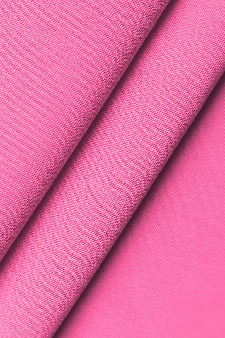 Хлопковый футер трёхнитка премиального качества компакт-пенье с комфортной плотностью полотна. Лицевая сторона — гладкая, матовая, с ровными рядами аккуратных «футерных» столбиков. Изнанка — классическая объёмная петля. Драпируется мягкими крупными складками. Не имеет выраженной формоустойчивости. Тянется только за счёт трикотажной структуры полотна. Предназначен для пошива свитшотов, худи, брюк и других трикотажных изделий плоского кроя.