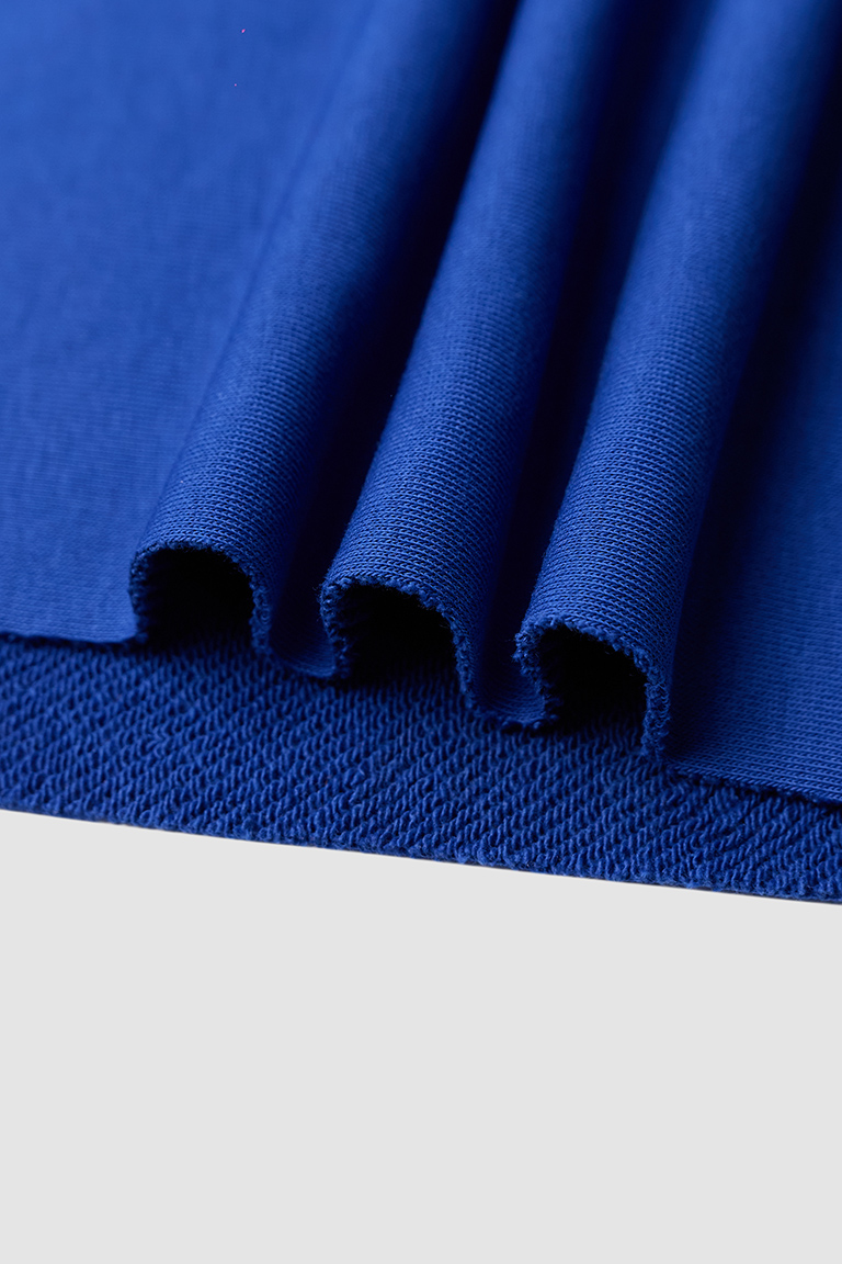 Хлопковый футер трёхнитка премиального качества компакт-пенье с комфортной плотностью полотна. Лицевая сторона — гладкая, матовая, с ровными рядами аккуратных «футерных» столбиков. Изнанка — классическая объёмная петля. Драпируется мягкими крупными складками. Не имеет выраженной формоустойчивости. Тянется только за счёт трикотажной структуры полотна. Предназначен для пошива свитшотов, худи, брюк и других трикотажных изделий плоского кроя.