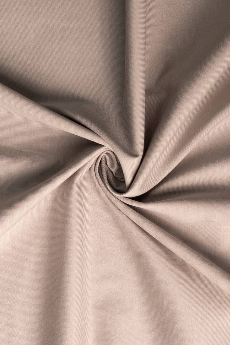 Мерсеризованная кулирная гладь премиального качества компакт-пенье. Лицевая сторона — гладкая, слегка глянцевая, с едва заметными рядами лицевых петель. Изнанка — мягкая, тактильно приятная к коже. Хорошо тянется, драпируется мелкими складками.