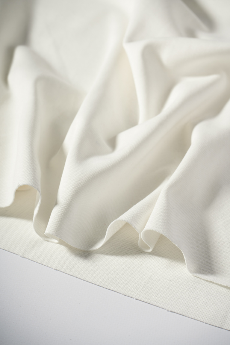 Мягкий хлопковый трикотаж премиального качества компакт-пенье. Хорошо тянется в поперечном направлении, держит форму, обладает средней драпируемостью. Лицевая и изнаночная стороны полотна гладкие, тактильно приятные к телу. Предназначен для оформления горловин, манжет и поясов в вещах из кулирной глади и футера-двунитки. Может использоваться для пошива вещей первого слоя с плотной посадкой по фигуре – топов, боди, маек и белья.