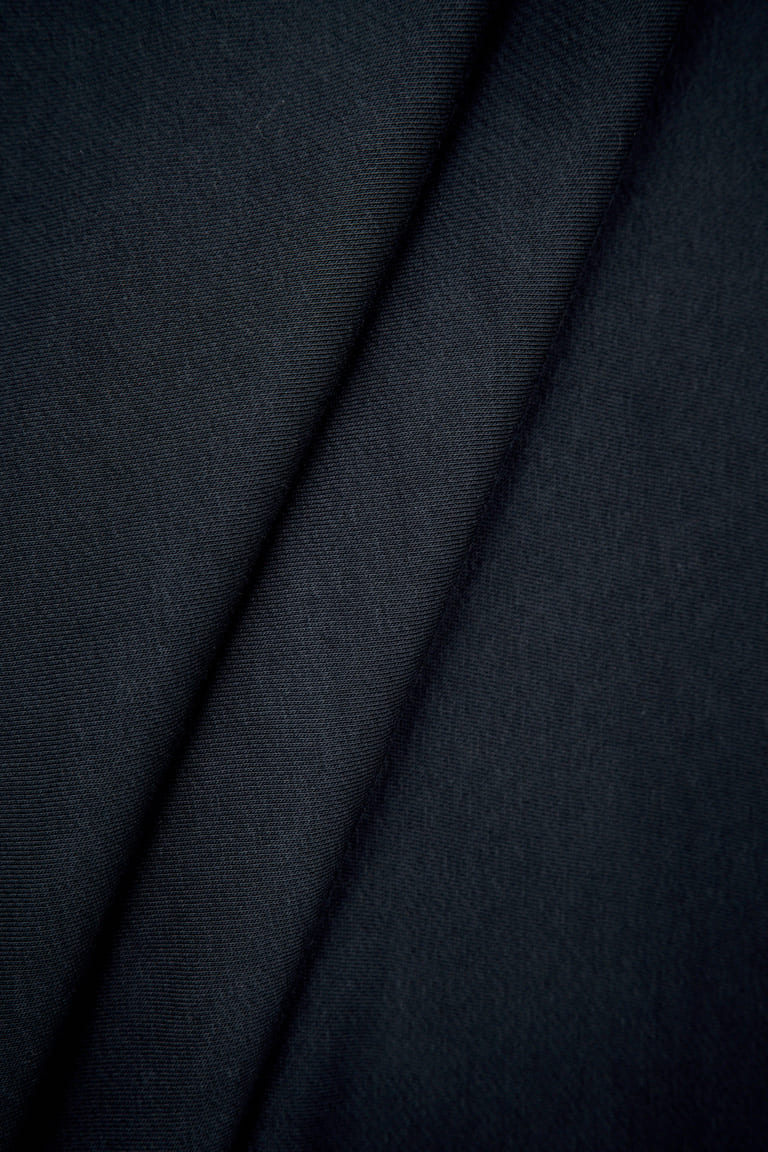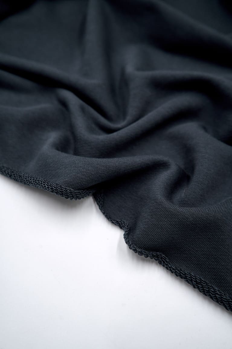 Хлопковый футер трёхнитка премиального качества компакт-пенье с комфортной плотностью полотна. Лицевая сторона — гладкая, матовая, с ровными рядами аккуратных «футерных» столбиков. Изнанка — классическая объёмная петля. Драпируется мягкими крупными складками. Не имеет выраженной формоустойчивости. Тянется только за счёт трикотажной структуры полотна. Предназначен для пошива свитшотов, худи, брюк и других трикотажных изделий плоского кроя.