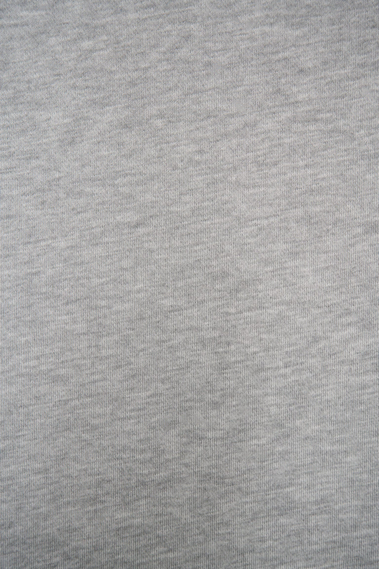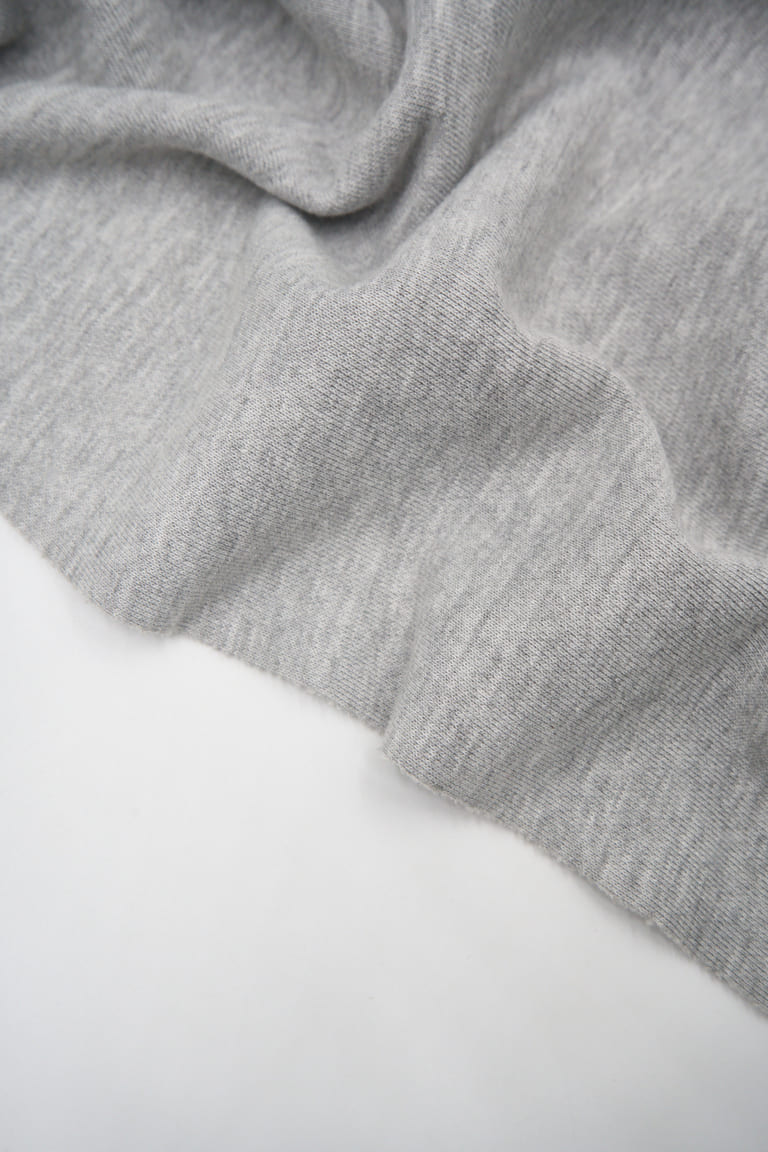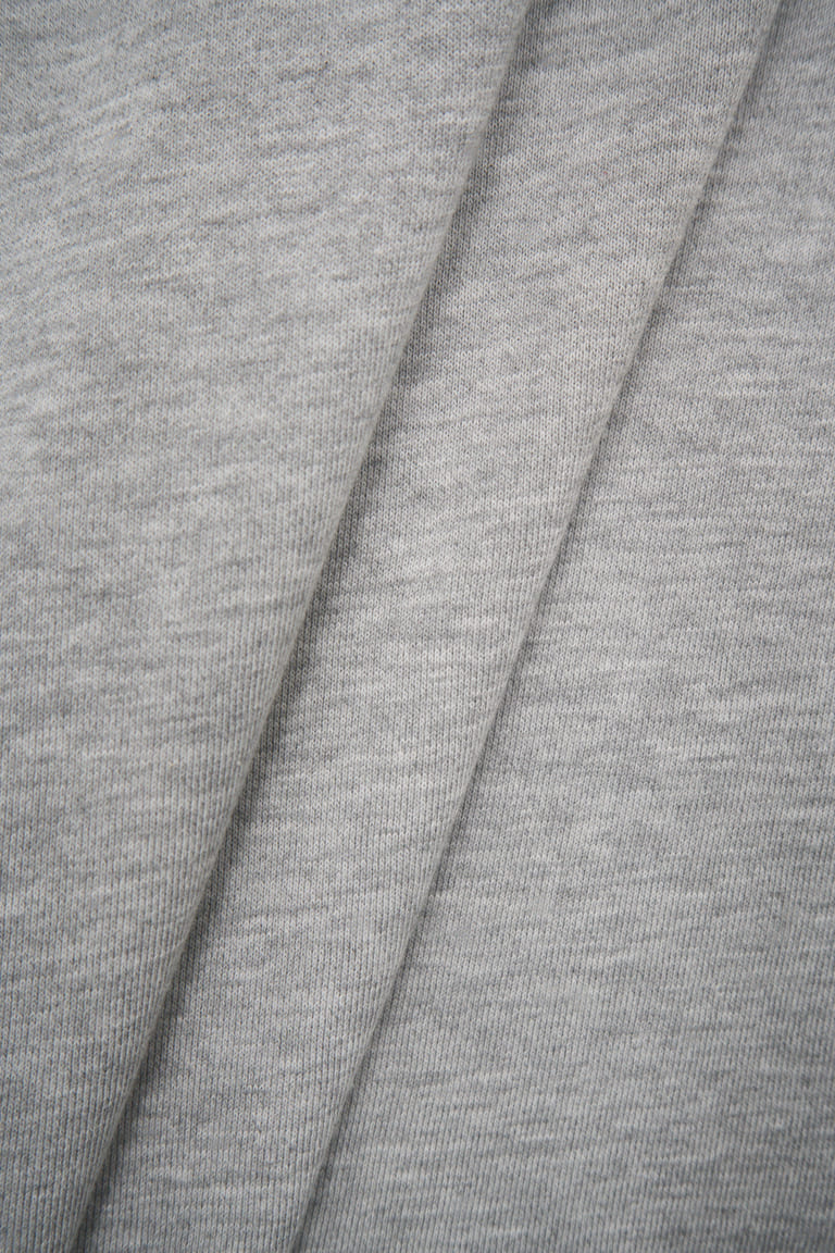 Хлопковый футер трёхнитка премиального качества компакт-пенье с меланжевым эффектом. Лицевая сторона — гладкая, матовая, с ровными рядами аккуратных «футерных» столбиков. Изнанка — классическая объёмная петля. Драпируется мягкими крупными складками. Не имеет выраженной формоустойчивости. Тянется только за счёт трикотажной структуры полотна. Предназначен для пошива свитшотов, худи, брюк и других трикотажных изделий плоского кроя.
