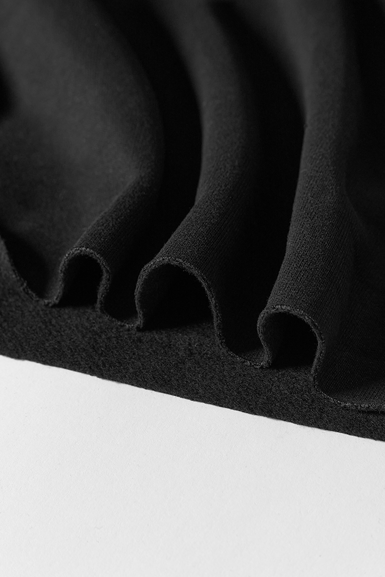 Хлопковый футер 3-х нитка повышенной плотности премиального качества компакт-пенье. Лицевая сторона гладкая, матовая, с едва заметным пушком, напоминающим фактуру персика. Изнанка – классическая объемная петля. Драпируется мягкими крупными складками. Не имеет выраженной формоустойчивости. Тянется только за счёт трикотажной структуры полотна. Предназначен для пошива свитшотов, худи, брюк и других трикотажных изделий плоского кроя.