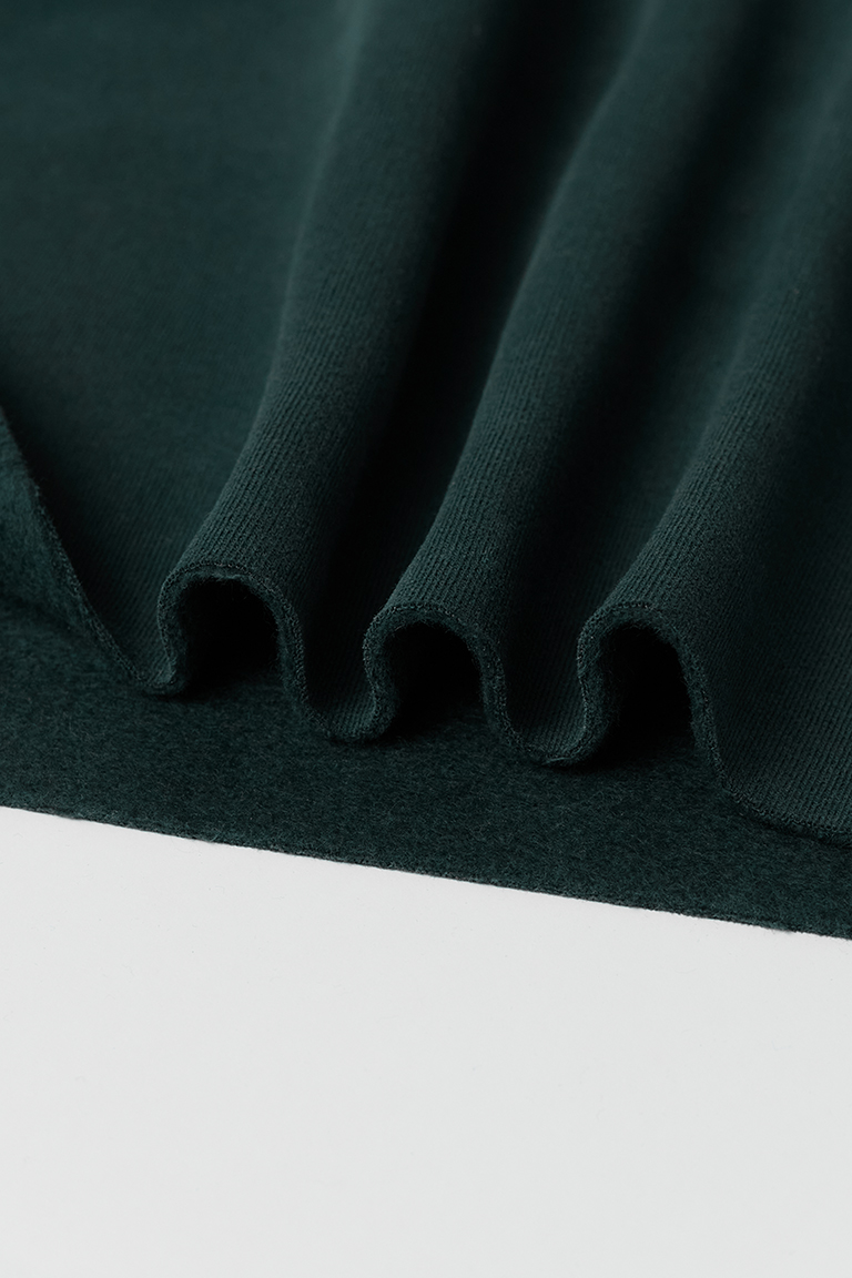 Хлопковый футер премиального качества «компакт-пенье» с велюровым эффектом на лицевой стороне полотна. Изнанка — стриженый начёс: плотный, однородный, меньше пилингуется и почти не пылит в процессе кроя (в сравнении с классикой). Не драпируется, обладает выраженной формоустойчивостью. Предназначен для пошива худи, джоггеров, тёплых платьев, свитшотов и других изделий плоского кроя.
