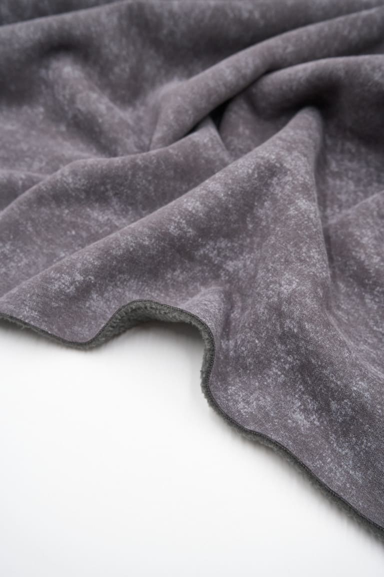 Тёплый футер с начёсом премиального качества «компакт-пенье». Лицевая сторона гладкая, матовая, с состаренным эффектом. Изнанка мягкая, тактильно приятная, с эффектом «барашка». Не мнётся, драпируется крупными складками, обладает хорошей формоустойчивостью. Предназначен для пошива худи, свитшотов, джоггеров, комбинезонов и другой тёплой одежды для прохладного времени года.