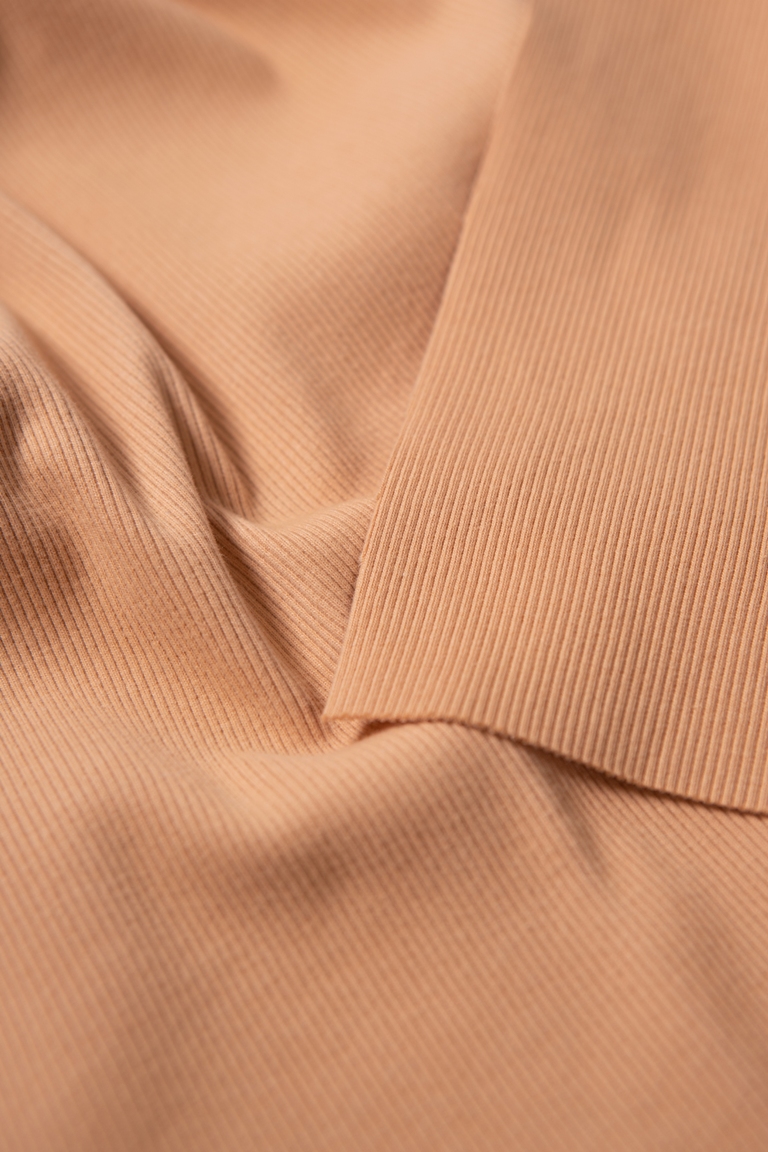 Мягкий хлопковый кашкорсе премиального качества компакт-пенье с велюровым эффектом на лицевой стороне полотна. Хорошо тянется в поперечном направлении, держит форму, почти не драпируется. Лицевая и изнаночная стороны имеют характерный «рубчик». Предназначен для оформления горловин, манжет и поясов в вещах из футера 2, 3-х нитки с велюровым эффектом (Peach Effect). Может использоваться для пошива самостоятельных изделий с плотной посадкой по фигуре – топов, водолазок, легинсов, велосипедок и т.д.