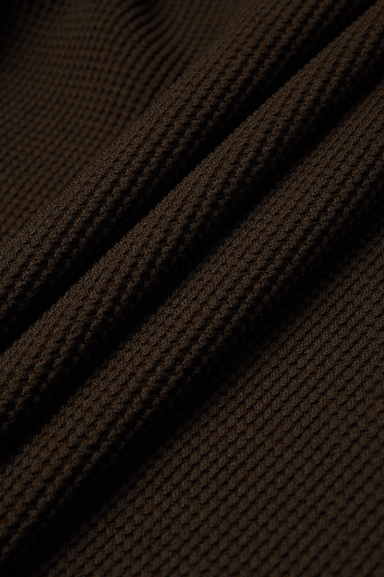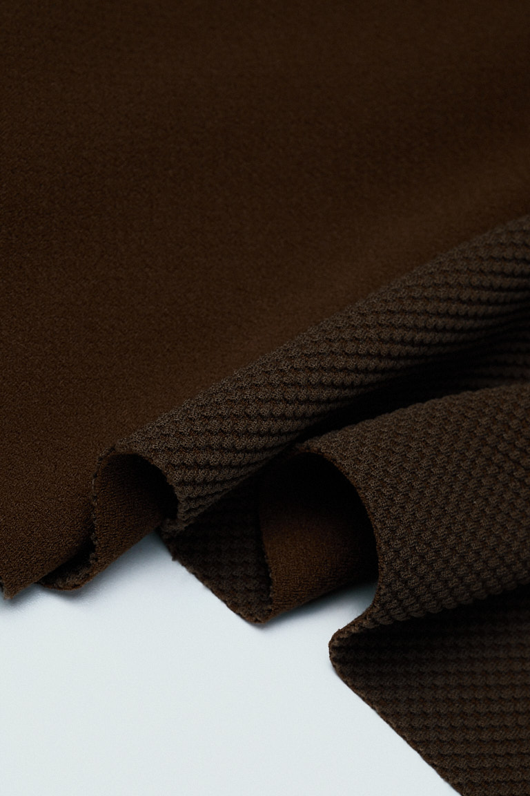 Трикотажное полотно плотностью 415 гр/м2. Лицевая сторона материала фактурная, с объемным рисунком, напоминающим пчелиные соты. Изнанка гладкая, тактильно приятная к телу. Не драпируется, обладает выраженной формоустойчивостью, хорошо тянется. Подходит для пошива бомберов, свитшотов, шортов, юбок и других изделий плоского кроя.