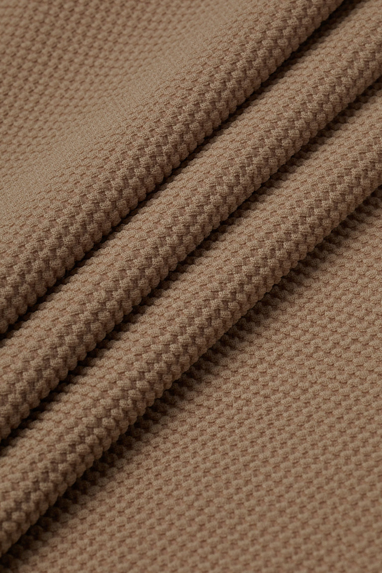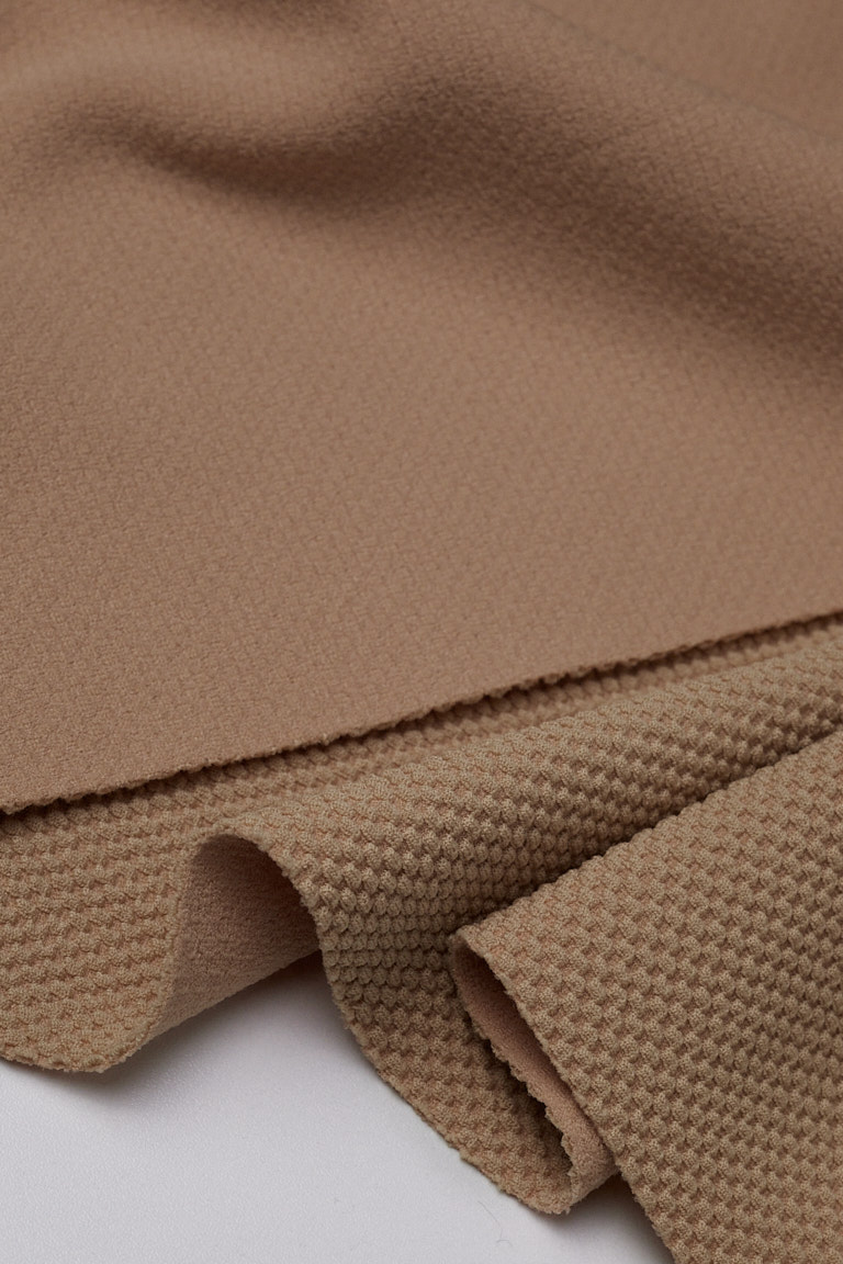 Трикотажное полотно плотностью 415 гр/м2. Лицевая сторона материала фактурная, с объемным рисунком, напоминающим пчелиные соты. Изнанка гладкая, тактильно приятная к телу. Не драпируется, обладает выраженной формоустойчивостью, хорошо тянется. Подходит для пошива бомберов, свитшотов, шортов, юбок и других изделий плоского кроя.